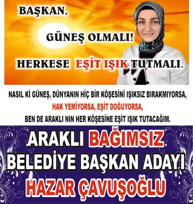 Araklı Bağımsız Belediye Başkanı Hazal Çavuşoğlun dan Arı Habere ÖZEL açıklama Araklı’mız Trabzonun 2. Büyük İlçesi olmasına rağmen, olması gereken yerde olmadığı açıkça görülüyor. Belediye Başkanlarının, şahsi menfaatler peşinde koşmaları ve oy toplamak uğruna Araklı Belediyesini gereksiz kadro ile doldurmaları bunun birkaç sebebidir. Belediye gereksiz yere şişirilmemeli. yeni iş sahaları üretip, buralarda işsiz nüfusumuz istihdam edilmeli.