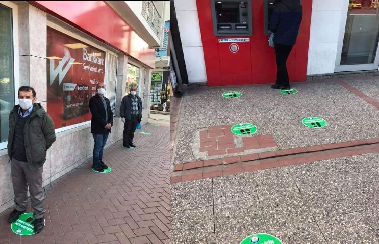 Vatandaşlar bankalar ve ATM’lerde işlemlerini halletmek için sıra beklerken mesafelerini korumaları için yere stickerlar yapıştırıldı.