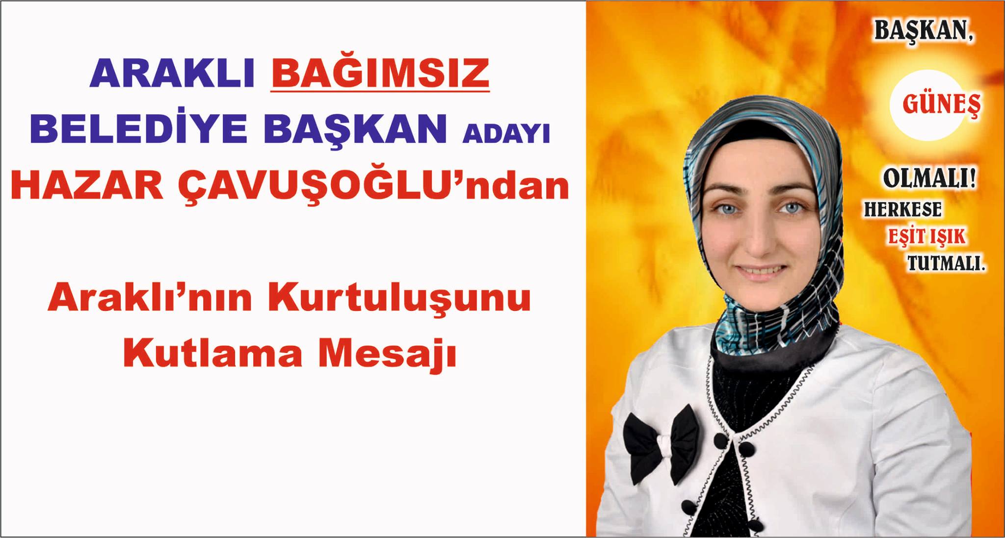Araklı’mızın kurtuluşunun 96. yılında vatanımızı kurtarmak pahasına kanlarını akıtan şehitlerimizi sevgiyle anar, Araklı halkımıza bu güzel yöremize en iyi şekilde sahip çıkmasını, en iyi şekilde tanıtmasını ve en iyi şekilde tanıtacak yöneticilere bırakmasını temenni eder, herkesi saygıyla selamlarım.